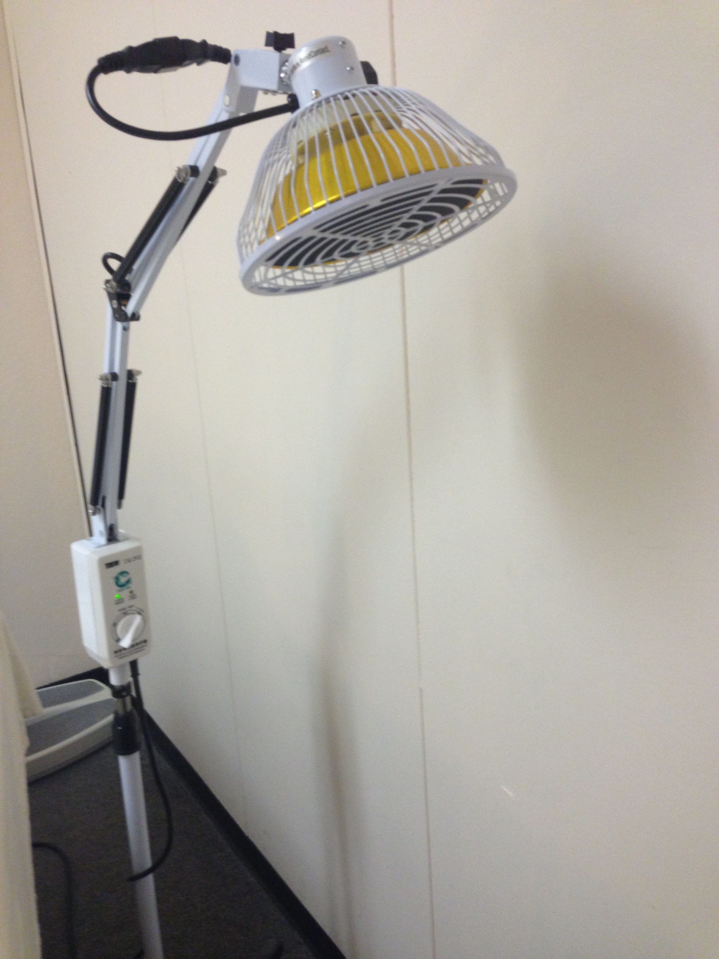 The heating lamp used is an infrared lamp. It emits energy in the infrared spectrum to provide topical heating for the purpose of elevating tissue temperature, to increase local blood circulation.
